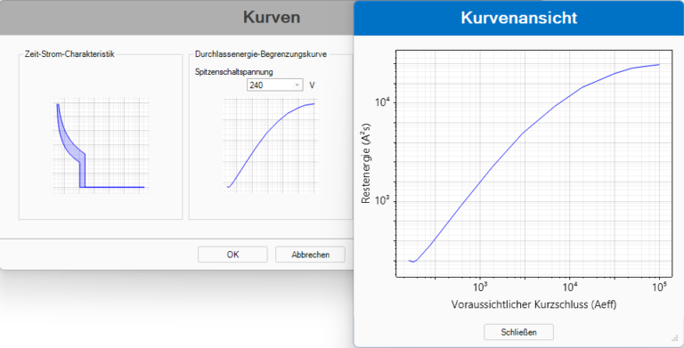 Der in elec calc integrierte Multi-Hersteller-Katalog  ermöglicht die direkte Auswertung herstellerspezifischer Begrenzungskurven. Wird eine schaltende Schutzeinrichtung mit Energiebegrenzung ausgewählt, berücksichtigt die Software automatisch die entsprechende Restenergie in Abhängigkeit vom angenommenen Kurzschlussstrom.